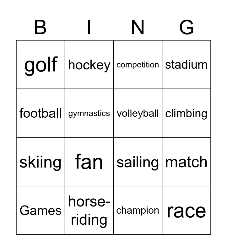 This bingo card has 25 words: athletics, basketball, climbing, cycling, football, golf, gymnastics, hockey, horse-riding, rugby, skiing, sailing, swimming, tennis, volleyball, wrestling, champion, competition, fan, match, Games, player, race, stadium and team.