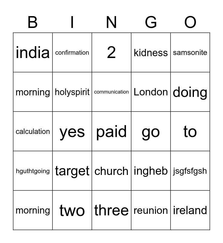 This bingo card has a free space and 39 words: yu, tu, ui, ingheb, jsgfsfgsh, hguthtgoing, yes, relate, go, to, morning, confirmation, coin, doing, calculation, target, church, kidness, goodness, morning, holyspirit, communication, reunion, samsonite, one, two, three, four, five, india, UK, Goa, London, ireland, 13, 3, 2, 232 and 6767.