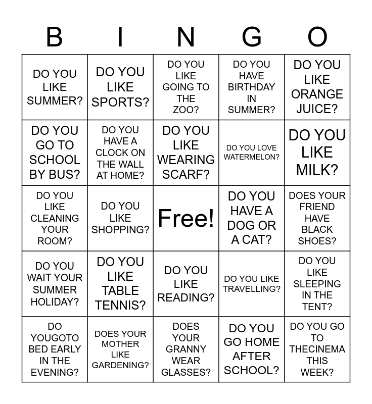 This bingo card has a free space and 24 words: DO YOU LIKE TABLE TENNIS?, DOES YOUR MOTHER LIKE GARDENING?, DO YOU LIKE WEARING SCARF?, DO YOUGOTO BED EARLY IN THE EVENING?, DO YOU LIKE ORANGE JUICE?, DO YOU LIKE SUMMER?, DO YOU GO TO SCHOOL BY BUS?, DO YOU LIKE SPORTS?, DO YOU HAVE A DOG OR A CAT?, DO YOU LIKE READING?, DO YOU LOVE WATERMELON?, DO YOU LIKE CLEANING YOUR ROOM?, DO YOU LIKE TRAVELLING?, DO YOU LIKE SLEEPING IN THE TENT?, DO YOU HAVE A CLOCK ON THE WALL AT HOME?, DO YOU GO HOME AFTER SCHOOL?, DOES YOUR FRIEND HAVE BLACK SHOES?, DO YOU LIKE GOING TO THE ZOO?, DO YOU LIKE MILK?, DO YOU LIKE SHOPPING?, DO YOU GO TO THECINEMA THIS WEEK?, DO YOU WAIT YOUR SUMMER HOLIDAY?, DO YOU HAVE BIRTHDAY IN SUMMER? and DOES YOUR GRANNY WEAR GLASSES?.