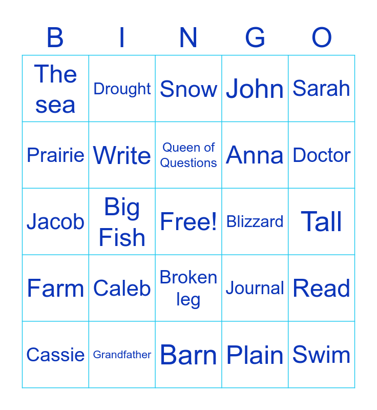 This bingo card has a free space and 24 words: Caleb, Grandfather, Queen of Questions, Cassie, Sarah, The sea, Prairie, Drought, Blizzard, Broken leg, Anna, Jacob, Journal, Read, Write, Plain, Tall, Snow, Doctor, Big Fish, Swim, Farm, John and Barn.