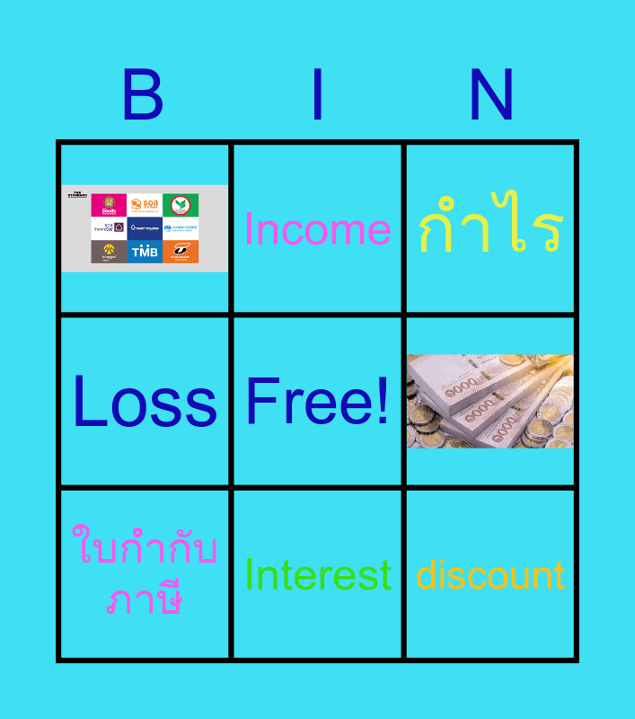This bingo card has 2 images, a free space and 9 words: วัตถุดิบ, เจ้าหนี้, ใบกำกับภาษี, กำไร, Interest, ค่าใช้จ่าย, Loss, Income and discount.