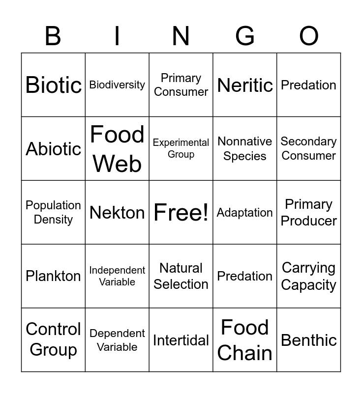 This bingo card has a free space and 24 words: Independent Variable, Dependent Variable, Experimental Group, Control Group, Predation, Biotic, Abiotic, Biodiversity, Adaptation, Natural Selection, Nonnative Species, Population Density, Predation, Carrying Capacity, Food Web, Food Chain, Primary Producer, Primary Consumer, Secondary Consumer, Nekton, Benthic, Plankton, Neritic and Intertidal.