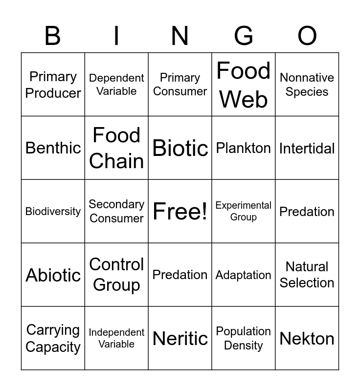 This bingo card has a free space and 24 words: Control Group, Independent Variable, Biotic, Carrying Capacity, Nonnative Species, Primary Producer, Benthic, Dependent Variable, Experimental Group, Predation, Plankton, Biodiversity, Adaptation, Natural Selection, Food Chain, Population Density, Predation, Primary Consumer, Intertidal, Secondary Consumer, Nekton, Abiotic, Food Web and Neritic.