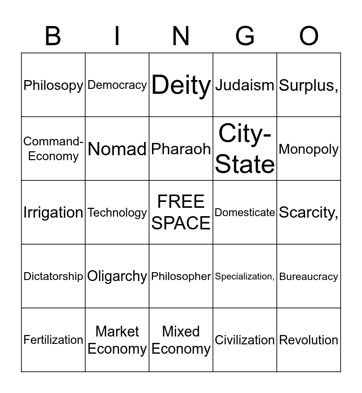 This bingo card has a free space and 28 words: Bureaucracy, Anthropology, City-State, Civilization, Command-Economy, Deity, Democracy, Dictatorship, Domesticate, Fertilization, Irrigation, Judaism, Market Economy, Mixed Economy, Monopoly, Monotheism, Oligarchy, Nomad, Pharaoh, Philosopher, Philosopy, Polytheism, Revolution, Technology, Scarcity,, Specialization,, Surplus, and Synagogue.
