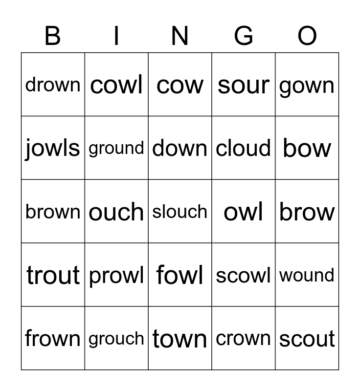 This bingo card has 25 words: prowl, town, down, frown, gown, drown, jowls, cowl, owl, fowl, cloud, brown, scowl, wound, ground, scout, brow, cow, bow, ouch, slouch, grouch, trout, sour and crown.