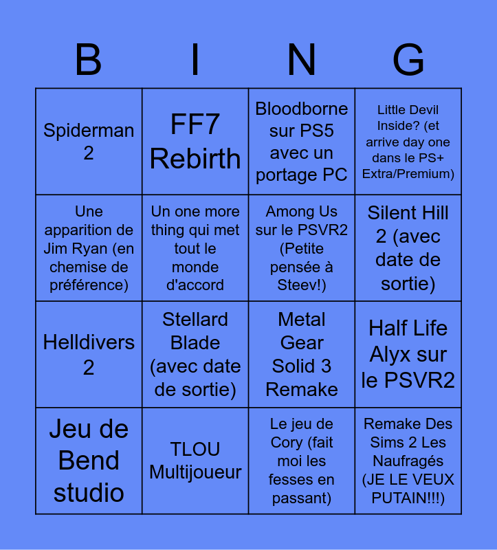 This bingo card has 16 words: TLOU Multijoueur, Half Life Alyx sur le PSVR2, Bloodborne sur PS5 avec un portage PC, Spiderman 2, Helldivers 2, FF7 Rebirth, Metal Gear Solid 3 Remake, Le jeu de Cory (fait moi les fesses en passant), Une apparition de Jim Ryan (en chemise de préférence), Un one more thing qui met tout le monde d'accord, Jeu de Bend studio, Little Devil Inside? (et arrive day one dans le PS+ Extra/Premium), Stellard Blade (avec date de sortie), Silent Hill 2 (avec date de sortie), Among Us sur le PSVR2 (Petite pensée à Steev!) and Remake Des Sims 2 Les Naufragés (JE LE VEUX PUTAIN!!!).