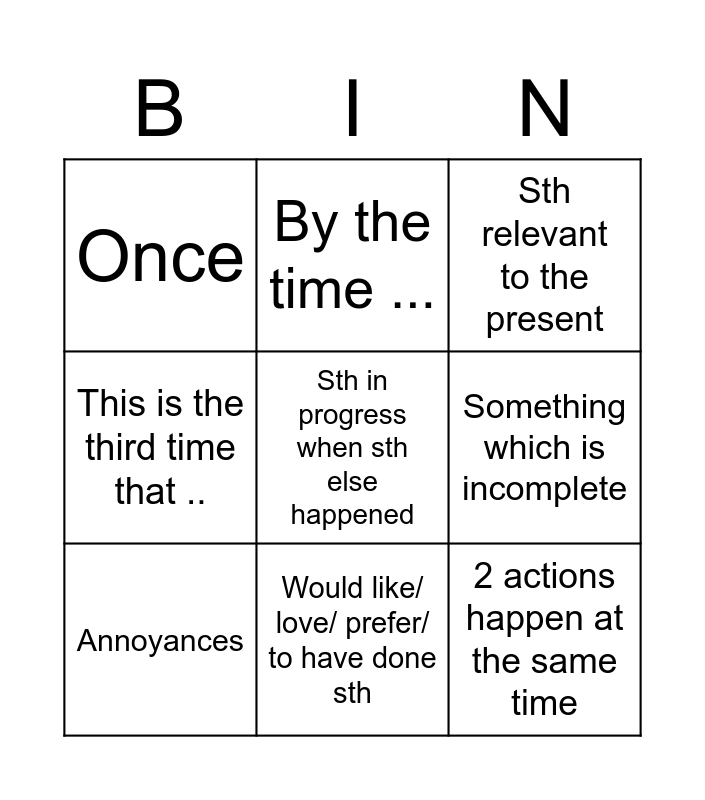 This bingo card has 11 words: Used to/ would, Sth in progress when sth else happened, 2 actions happen at the same time, Annoyances, By the time ..., Sth relevant to the present, This is the third time that .., It's a long time since, Something which is incomplete, Once and Would like/ love/ prefer/ to have done sth.