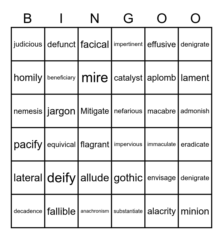 This bingo card has 36 words: gothic, allude, substantiate, homily, pacify, nefarious, beneficiary, anachronism, effusive, envisage, lament, impertinent, denigrate, jargon, catalyst, judicious, lateral, macabre, nemesis, facical, Mitigate, equivical, impervious, flagrant, immaculate, defunct, aplomb, fallible, mire, denigrate, minion, decadence, eradicate, admonish, deify and alacrity.