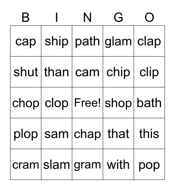 This bingo card has a free space and 24 words: sam, slam, cam, cram, clap, cap, shut, ship, shop, chap, chip, chop, that, this, than, with, bath, path, clip, clop, pop, plop, glam and gram.