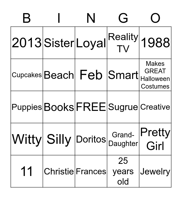 This bingo card has a free space and 24 words: Silly, Christie, Feb, 11, 1988, 2013, Cupcakes, Sister, Sugrue, Doritos, Smart, Puppies, Grand- Daughter, Pretty Girl, Beach, 25 years old, Creative, Loyal, Makes GREAT Halloween Costumes, Books, Jewelry, Witty, Reality TV and Frances.