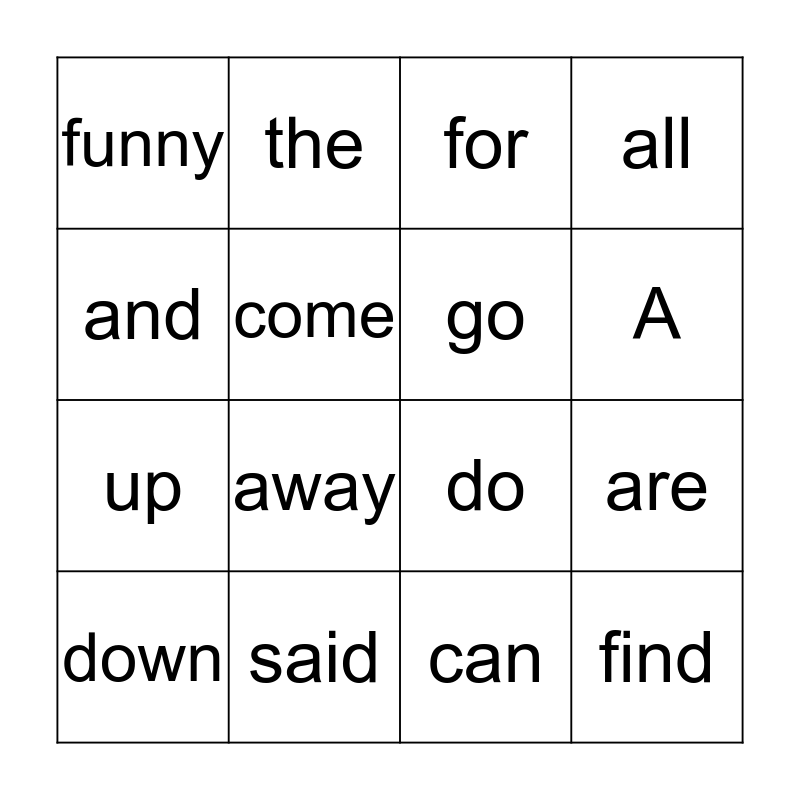 This bingo card has a free space and 15 words: down, find, for, funny, A, and, away, can, come, up, are, all, go, the and said.