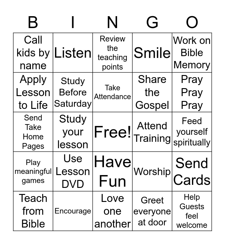 This bingo card has a free space and 24 words: Use Lesson DVD, Encourage, Take Attendance, Teach from Bible, Work on Bible Memory, Call kids by name, Apply Lesson to Life, Listen, Attend Training, Have Fun, Share the Gospel, Send Take Home Pages, Worship, Send Cards, Study Before Saturday, Greet everyone at door, Feed yourself spiritually, Review the teaching points, Pray Pray Pray, Study your lesson, Help Guests feel welcome, Play meaningful games, Smile and Love one another.
