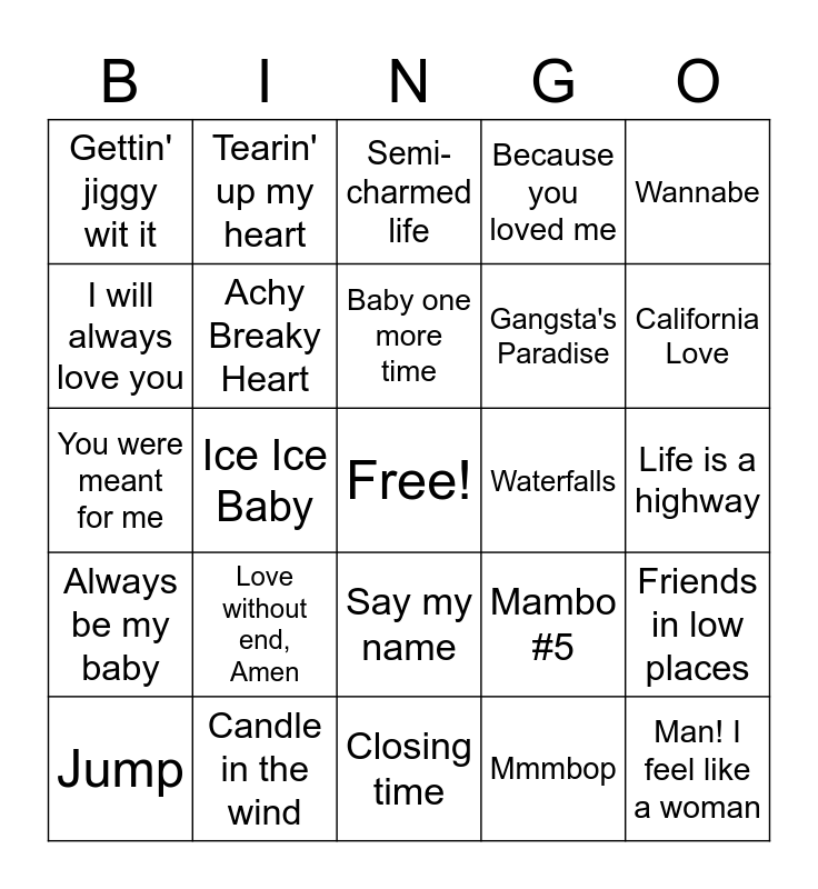This bingo card has a free space and 31 words: Closing time, Shoop, Ice Ice Baby, Janie's got a gun, Gettin' jiggy wit it, Semi-charmed life, Achy Breaky Heart, Mambo #5, Waterfalls, Mmmbop, Life is a highway, Man! I feel like a woman, Macerena, Just a Girl, California Love, All Star, Friends in low places, Love without end, Amen, Always be my baby, Say my name, Wannabe, Smells like teen spirit, Jump, Tearin' up my heart, Gangsta's Paradise, I will always love you, Because you loved me, You were meant for me, Candle in the wind, Baby one more time and Livin' La Vida Loca.