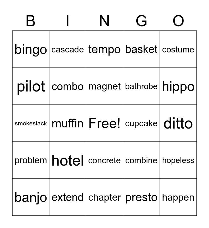 This bingo card has a free space and 24 words: hotel, extend, magnet, banjo, costume, bingo, pilot, cascade, cupcake, concrete, bathrobe, smokestack, combine, hopeless, combo, presto, ditto, tempo, hippo, muffin, happen, problem, basket and chapter.