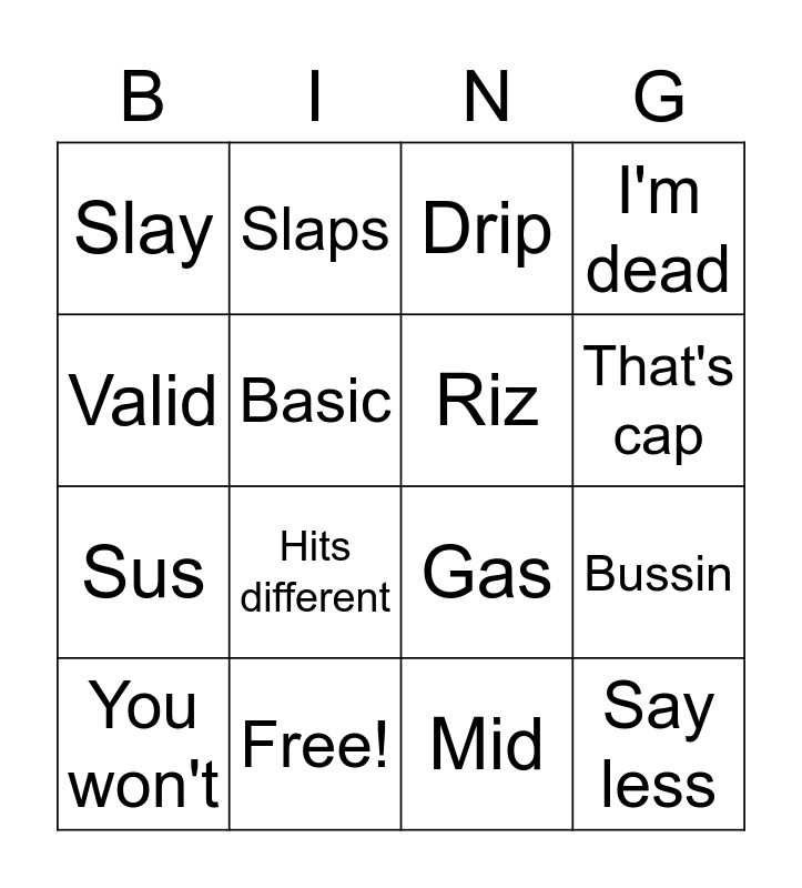 This bingo card has 16 words: Free!, Bussin, Drip, Slay, Sus, Slaps, Gas, Mid, Valid, Basic, You won't, I'm dead, Hits different, That's cap, Riz and Say less.