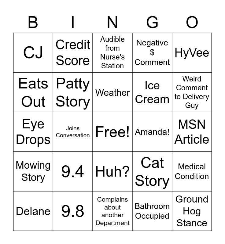 This bingo card has a free space and 24 words: 9.4, 9.8, Weather, Delane, HyVee, CJ, Eats Out, Credit Score, Amanda!, Huh?, Ice Cream, Eye Drops, Cat Story, Medical Condition, Patty Story, Bathroom Occupied, MSN Article, Audible from Nurse's Station, Weird Comment to Delivery Guy, Joins Conversation, Ground Hog Stance, Mowing Story, Negative $ Comment and Complains about another Department.