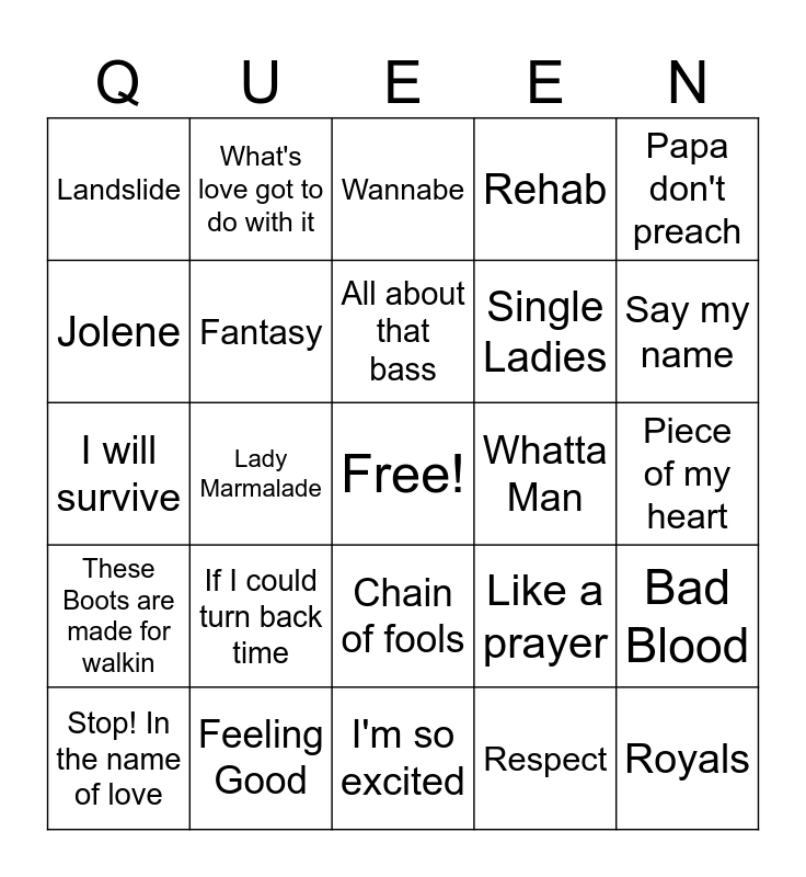 This bingo card has a free space and 60 words: My Guy, Feeling Good, Bang Bang, These Boots are made for walkin, Respect, Girl on fire, Fantasy, Nothing Compares 2 u, Single Ladies, Someone like you, Rehab, Bad Guy, Jolene, My Lovin', Bring me to life, Landslide, Royals, Papa don't preach, Flowers, All about that bass, Whatta Man, Wannabe, Stop! In the name of love, Bad Blood, I think we're alone now, No Scrubs, I will always love you, I wanna dance with somebody, Say my name, At Last, Don't speak, All I wanna do, Proud Mary, Rolling in the deep, What's love got to do with it, (You make me feel like) a natural woman, Dancing in the street, Lady Marmalade, Killing me softly with his song, I will survive, Doo Wop (That Thing), If I could turn back time, Piece of my heart, I'm coming out, Like a prayer, Girls just want to have fun, I'm every woman, You can't hurry love, How will I know, Chain of fools, I'm so excited, Think, I say a little prayer, Midnight train to Georgia, I heard it through the grapevine, Please Mr Postman, Son of a preacher man, Be my baby, Dedicated to the one I love and Dream a little dream of me.