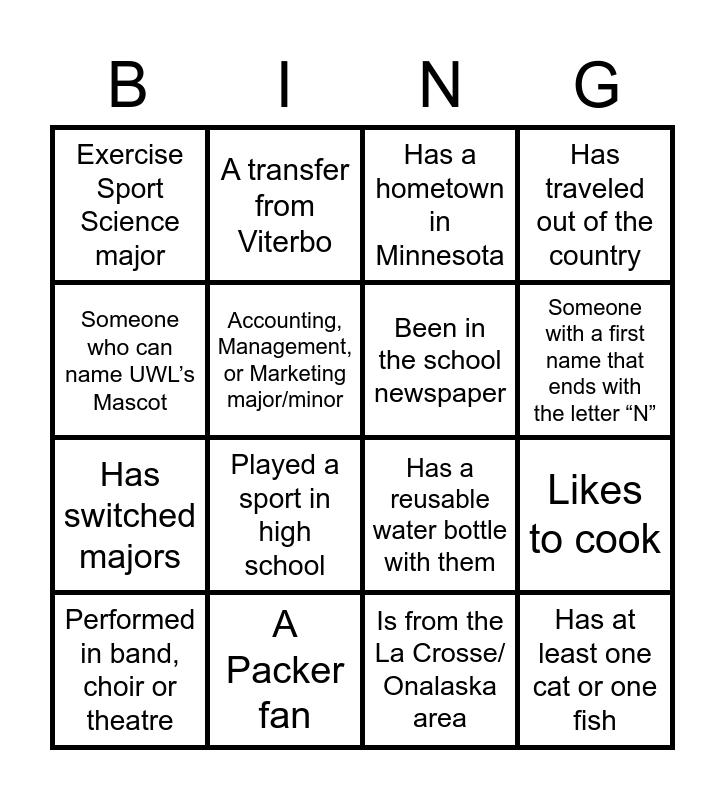 This bingo card has 22 words: A Packer fan, A transfer from a Wisconsin Technical College, A transfer from Viterbo, A Viking fan, Accounting, Management, or Marketing major/minor, Been in the school newspaper, Exercise Sport Science major, Has a hometown in Minnesota, Has a reusable water bottle with them, Has at least one cat or one fish, Has switched majors, Has traveled out of the country, Has two or more dogs, Is a Gamer, Is from the La Crosse/ Onalaska area, Last name begins with the letter “R”, Likes to cook, Performed in band, choir or theatre, Played a sport in high school, Someone who can name UWL’s Mascot, Someone with a first name that ends with the letter “N” and Wants to try the climbing wall.