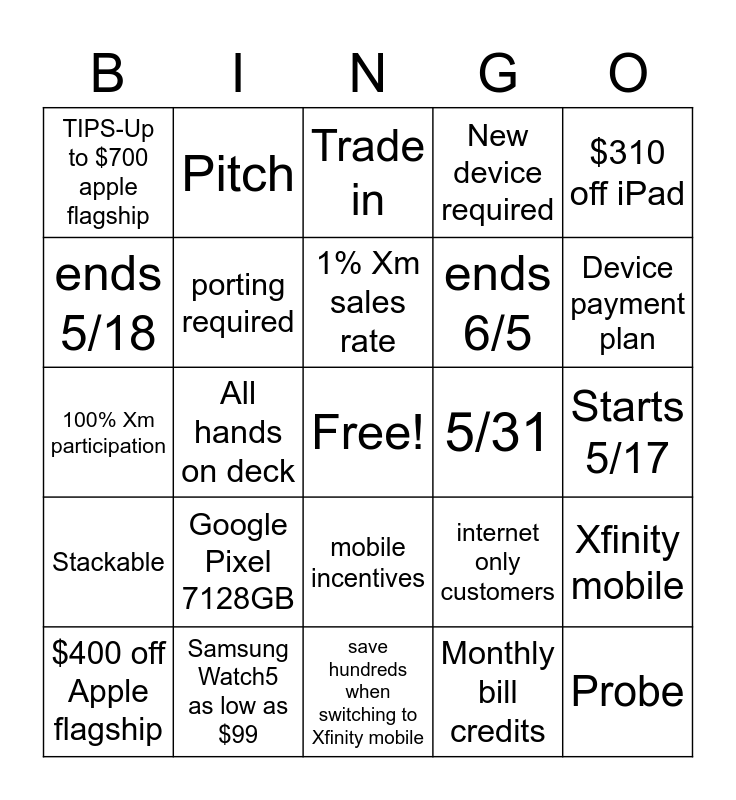 This bingo card has a free space and 24 words: Google Pixel 7128GB, Samsung Watch5 as low as $99, 1% Xm sales rate, $400 off Apple flagship, $310 off iPad, TIPS-Up to $700 apple flagship, ends 5/18, Pitch, 5/31, mobile incentives, ends 6/5, 100% Xm participation, internet only customers, Xfinity mobile, porting required, Monthly bill credits, Starts 5/17, Trade in, Device payment plan, All hands on deck, Probe, Stackable, New device required and save hundreds when switching to Xfinity mobile.