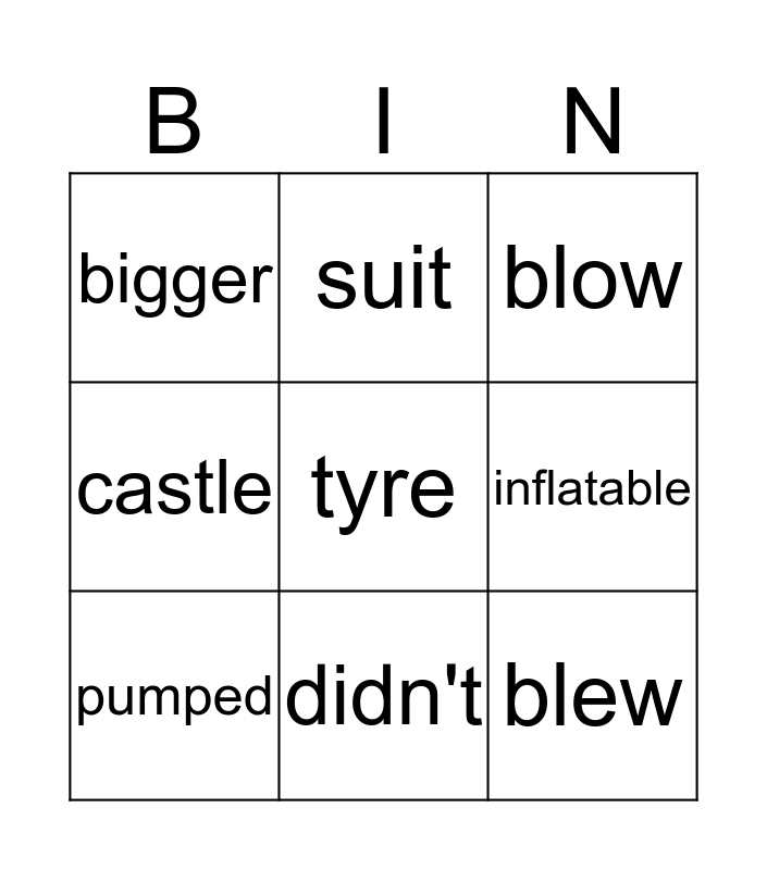 This bingo card has a free space and 8 words: inflatable, blow, suit, pumped, bigger, blew, castle and didn't.