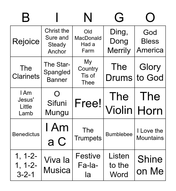 This bingo card has a free space and 24 words: I Am a C, Viva la Musica, My Country Tis of Thee, 1, 1-2-1, 1-2-3-2-1, God Bless America, Rejoice, The Clarinets, Christ the Sure and Steady Anchor, The Violin, The Trumpets, The Drums, I Am Jesus' Little Lamb, Bumblebee, I Love the Mountains, The Star-Spangled Banner, Listen to the Word, The Horn, Old MacDonald Had a Farm, Glory to God, O Sifuni Mungu, Shine on Me, Benedictus, Ding, Dong Merrily and Festive Fa-la-la.