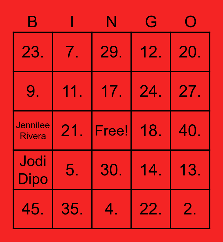 This bingo card has a free space and 50 words: Archibald, Monica, 2., 3., 4., 5., 6., 7., 8., 9., 10., 11., 12., 13., 14., 15., 16., 17., 18., 19., 20., 21., 22., 23., 24., 25., 26., 27., 28., 29., 30., 31., 32., 33., 34., 35., 36., 37., 38., 39., 40., 41., 42., 43., 44., 45., Jennilee Rivera, Ben Jensen, Lyn Cheney, Jodi Dipo and Ivonni (lunch worker).