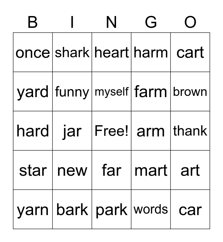 This bingo card has a free space and 27 words: mart, card, farm, park, yard, heart, shark, star, arm, art, hard, harm, yarn, bark, brown, few, funny, myself, new, once, thank, words, jar, car, far, cart and chart.