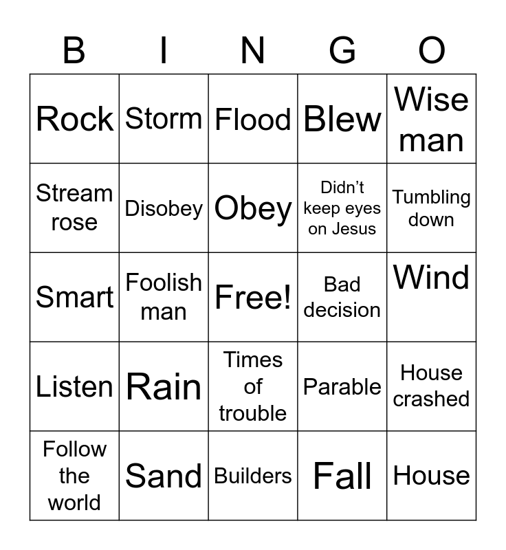 This bingo card has a free space and 24 words: Rain, Sand, Obey, Follow the world, Wise man, Rock, Stream rose, Storm, Bad decision, Times of trouble, Didn’t keep eyes on Jesus, Smart, Parable, House crashed, Disobey, Fall, Wind, Flood, Tumbling down, Foolish man, House, Listen, Blew and Builders.