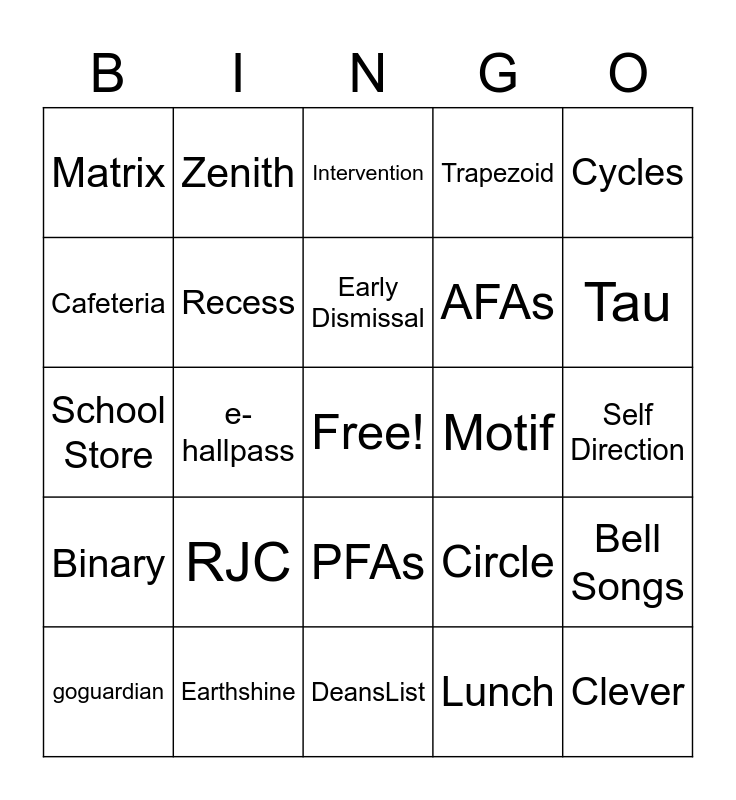 This bingo card has a free space and 24 words: RJC, Earthshine, Early Dismissal, goguardian, Cycles, Matrix, Cafeteria, Zenith, Motif, PFAs, AFAs, School Store, Circle, Bell Songs, Recess, Lunch, Self Direction, Intervention, Tau, e-hallpass, Clever, Binary, Trapezoid and DeansList.