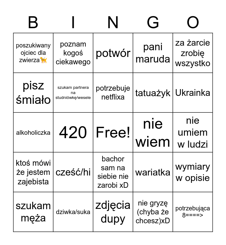 This bingo card has a free space and 50 words: nie znam się na tym tinderze, potrzebująca 8====>, ig/snap, zdjęcia dupy, cześć/hi, napisz pierwszy bo jestem nieśmiała, poznam kogoś ciekawego, lubię sarkazm, pisz śmiało, musisz mieć min 180cm, szukam partnera na studniówkę/wesele, pani maruda, wymiary w opisie, wariatka, eng opis a polka, bywam wredna/sarkastyczna, potrzebuje netflixa, nie wiem, shy baby girl, za żarcie zrobię wszystko, 420, nie gryzę (chyba że chcesz)xD, poszukiwany ojciec dla zwierza🦮, tatuażyk, promocja ig, wymagająca, Ukrainka, kolorowe włosy, potwór, bachor sam na siebie nie zarobi xD, overthink, po rozstaniu, człowiek depresja, psycholożka, dziwka/suka, feministka, lewaczka, ćpunek, poszukiwacz stałego związku, nie umiem w ludzi, nie fob/ons, studia to czas eksperymentów, śmieszek xD, inna niż wszystkie, szukam męża, alkoholiczka, typu Marcin, zodiakara, ktoś mówi że jestem zajebista and koniara.