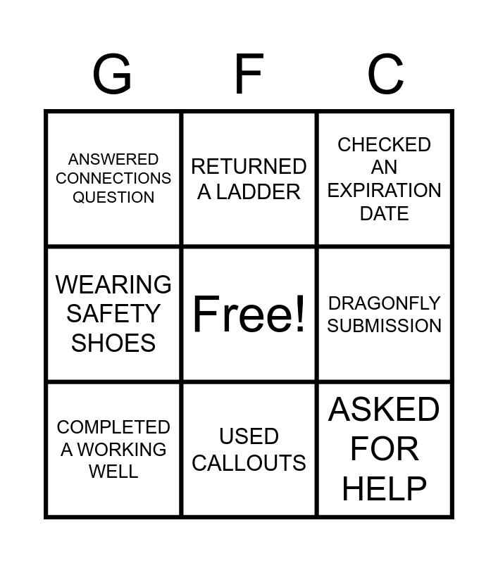 This bingo card has a free space and 8 words: DRAGONFLY SUBMISSION, CHECKED AN EXPIRATION DATE, RETURNED A LADDER, COMPLETED A WORKING WELL, ANSWERED CONNECTIONS QUESTION, ASKED FOR HELP, WEARING SAFETY SHOES and USED CALLOUTS.