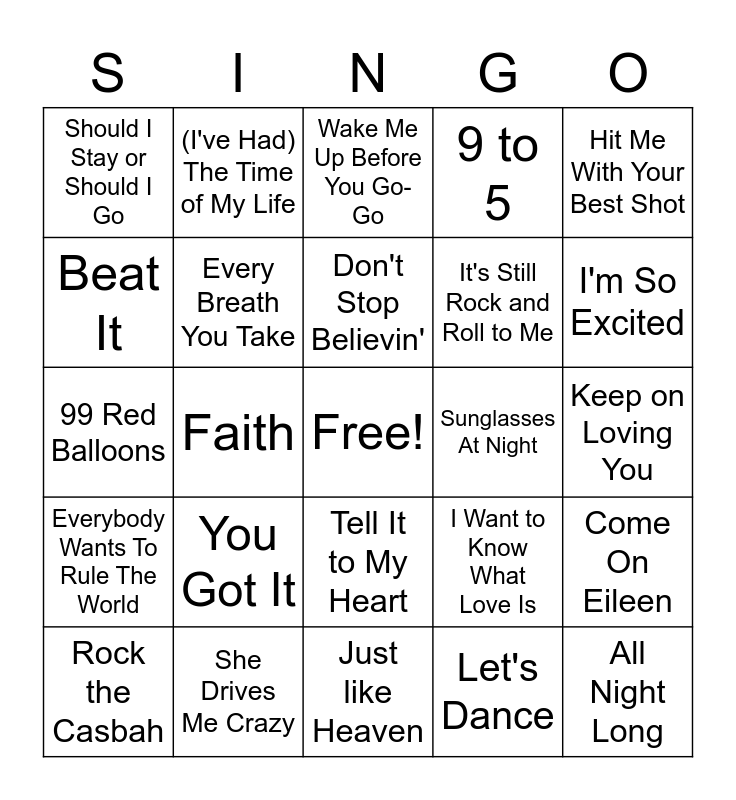This bingo card has a free space and 75 words: Take on Me, Africa, Wake Me Up Before You Go-Go, Hungry Like the Wolf, Girls Just Want to Have Fun, We Built This City, Sweet Dreams (Are Made of This), Maneater, Karma Chameleon, Billie Jean, Jessie's Girl, Eye of the Tiger, Don't Stop Believin', Beat It, Uptown Girl, Faith, We Didn't Start the Fire, All Night Long, Love Shack, Hit Me With Your Best Shot, Kiss, 99 Red Balloons, Every Breath You Take, (I've Had) The Time of My Life, 9 to 5, Dancing In the Dark, Danger Zone, Don't You (Forget About Me), Down Under, Easy Lover, Footloose, Holding Out for a Hero, I Wanna Dance with Somebody, I Want to Know What Love Is, I'm So Excited, It's Still Rock and Roll to Me, I'm Gonna Be (500 Miles), Jump (For My Love), Keep on Loving You, Let's Dance, Let's Hear It for the Boy, Material Girl, My Prerogative, Never Gonna Give You Up, Nothing's Gonna Stop Us Now, Oh Sherrie, Rock the Casbah, Should I Stay or Should I Go, Straight Up, Take Me Home Tonight, Take My Breath Away, Tell It to My Heart, The Power of Love, Thriller, Total Eclipse of the Heart, Walk Like an Egyptian, What I Like About You, Whip It, Who Can It Be Now?, You Can Call Me Al, You Got It, You Make My Dreams (Come True), Your Love, You Spin Me Round (Like a Record), What A Feeling, Sunglasses At Night, Time After Time, How Will I Know, Jump, Come On Eileen, Everybody Wants To Rule The World, She Drives Me Crazy, Blue Monday, Just like Heaven and Don't You Want Me.