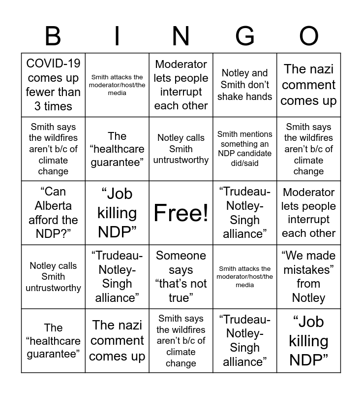 This bingo card has a free space and 59 words: “Job killing NDP”, The nazi comment comes up, “Can Alberta afford the NDP?”, Notley calls Smith untrustworthy, “Trudeau-Notley-Singh alliance”, Moderator lets people interrupt each other, The “healthcare guarantee”, “We made mistakes” from Notley, Smith mentions something an NDP candidate did/said, Smith calls the NDP socialist, Notley and Smith don’t shake hands, Someone says “that’s not true”, Smith says the wildfires aren’t b/c of climate change, Both claim they’ll stand up to Ottawa, Jason Kenney name drop, COVID-19 comes up fewer than 3 times, “Job killing NDP”, The nazi comment comes up, “Can Alberta afford the NDP?”, Notley calls Smith untrustworthy, “Trudeau-Notley-Singh alliance”, Moderator lets people interrupt each other, The “healthcare guarantee”, “We made mistakes” from Notley, Smith mentions something an NDP candidate did/said, Smith calls the NDP socialist, Notley and Smith don’t shake hands, Someone says “that’s not true”, Smith says the wildfires aren’t b/c of climate change, Both claim they’ll stand up to Ottawa, Jason Kenney name drop, COVID-19 comes up fewer than 3 times, Someone calls the other by their first name, Smith promises to solve crime downtown, Smith attacks the moderator/host/the media, Shot of Notley smiling into the camera while Smith attacks her, Girlboss moment about the two women onstage, “Job killing NDP”, The nazi comment comes up, “Can Alberta afford the NDP?”, Notley calls Smith untrustworthy, “Trudeau-Notley-Singh alliance”, Moderator lets people interrupt each other, The “healthcare guarantee”, “We made mistakes” from Notley, Smith mentions something an NDP candidate did/said, Smith calls the NDP socialist, Notley and Smith don’t shake hands, Someone says “that’s not true”, Smith says the wildfires aren’t b/c of climate change, Both claim they’ll stand up to Ottawa, Jason Kenney name drop, COVID-19 comes up fewer than 3 times, Someone calls the other by their first name, Smith promises to solve crime downtown, Smith attacks the moderator/host/the media, Shot of Notley smiling into the camera while Smith attacks her, Girlboss moment about the two women onstage and One of them says they respect the other.