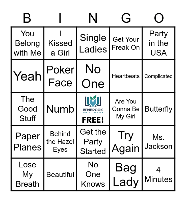 This bingo card has a free space and 60 words: Feel Good Inc, Beautiful, Umbrella, Paper Planes, Bag Lady, Back to Black, Poker Face, Family Affair, Heartbeats, Goodbye My Lover, Get Your Freak On, Chop Suey, Yeah, Hollaback Girl, D.A.N.C.E., You Belong with Me, 4 Minutes, Party in the USA, Bleeding Love, No One, Are You Gonna Be My Girl, Single Ladies, Lose My Breath, Ms. Jackson, Fergalicious, The Sweet Escape, Toxic, Chicken Fried, Complicated, A Thousand Miles, Jenny from the Block, Dilemma, Crazy, How You Remind Me, I Kissed a Girl, Lose Yourself, Mr. Brightside, Numb, I Try, The Good Stuff, Boulevard of Broken Dreams, Behind the Hazel Eyes, Butterfly, Closer, Try Again, Apologize, I Gotta Feeling, Dirty Little Secret, Hips Don’t Lie, Get the Party Started, No One Knows, The Reason, My Immortal, I Bet You Look Good on the Dancefloor, Vertigo, Kids, Seven Nation Army, 99 Problems, Hurt and Clocks.