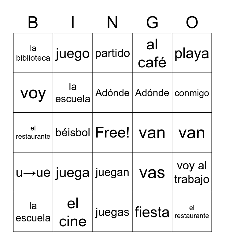 ⚠ This card has duplicate items: el cine (2), el restaurante (2), a la, al (2), juegas (2), juega (2), juegan (2), juego (2), u→ue (2), voy (2), conmigo (2), la escuela (2), al café (2), voy al trabajo (2), vas (2), va (2), partido (2), Adónde (2), van (2), vamos (2), playa (2), béisbol (2), fiesta (2), la biblioteca (2)
