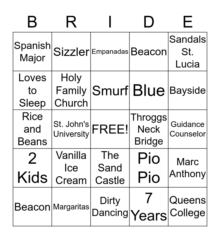 This bingo card has a free space and 24 words: Vanilla Ice Cream, Margaritas, Smurf, Beacon, Sandals St. Lucia, Spanish Major, Loves to Sleep, Sizzler, Throggs Neck Bridge, The Sand Castle, Blue, Rice and Beans, Pio Pio, Marc Anthony, Holy Family Church, 7 Years, Guidance Counselor, Empanadas, Bayside, St. John's University, Queens College, 2 Kids, Beacon and Dirty Dancing.