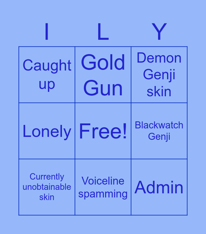 This bingo card has a free space and 8 words: Blackwatch Genji, Demon Genji skin, Gold Gun, Currently unobtainable skin, Caught up, Admin, Lonely and Voiceline spamming.