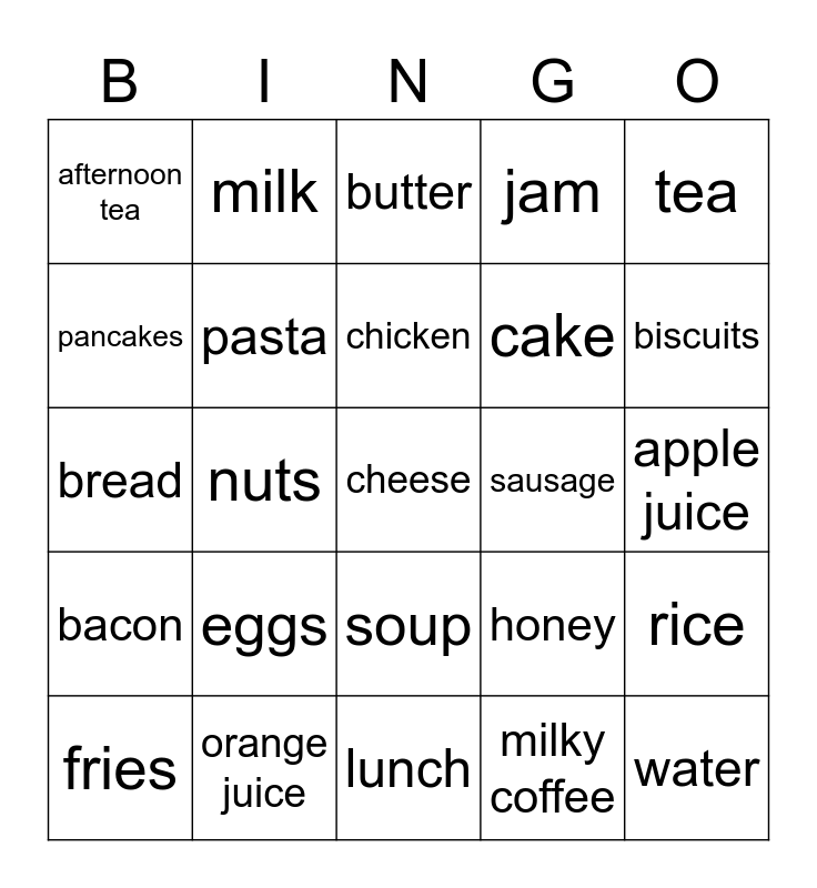 This bingo card has a free space and 24 words: eggs, orange juice, chicken, fries, tea, afternoon tea, pancakes, milk, sausage, soup, cake, bread, honey, rice, pasta, milky coffee, apple juice, butter, biscuits, nuts, water, bacon, jam and lunch.