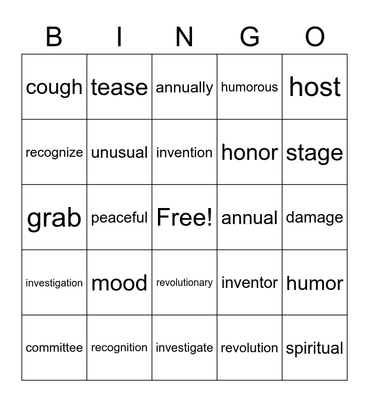 This bingo card has a free space and 24 words: mood, recognition, invention, committee, host, cough, recognize, tease, annual, revolutionary, honor, grab, inventor, humor, unusual, revolution, damage, annually, stage, peaceful, spiritual, investigation, humorous and investigate.