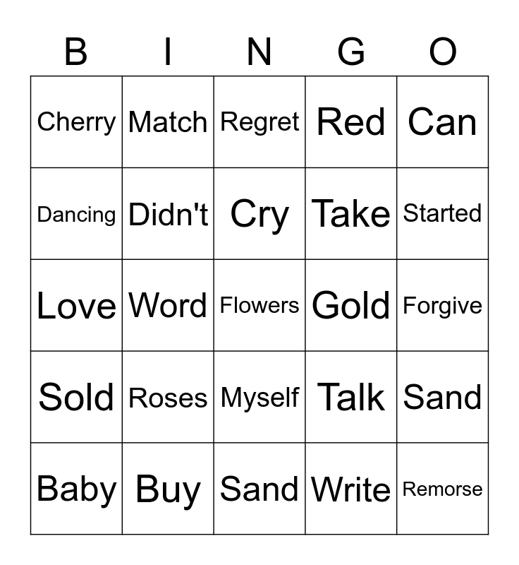 This bingo card has a free space and 24 words: Roses, Buy, Cry, Baby, Can, Cherry, Dancing, Match, Gold, Myself, Take, Love, Talk, Sand, Didn't, Write, Forgive, Regret, Started, Word, Remorse, Sold, Red and Sand.