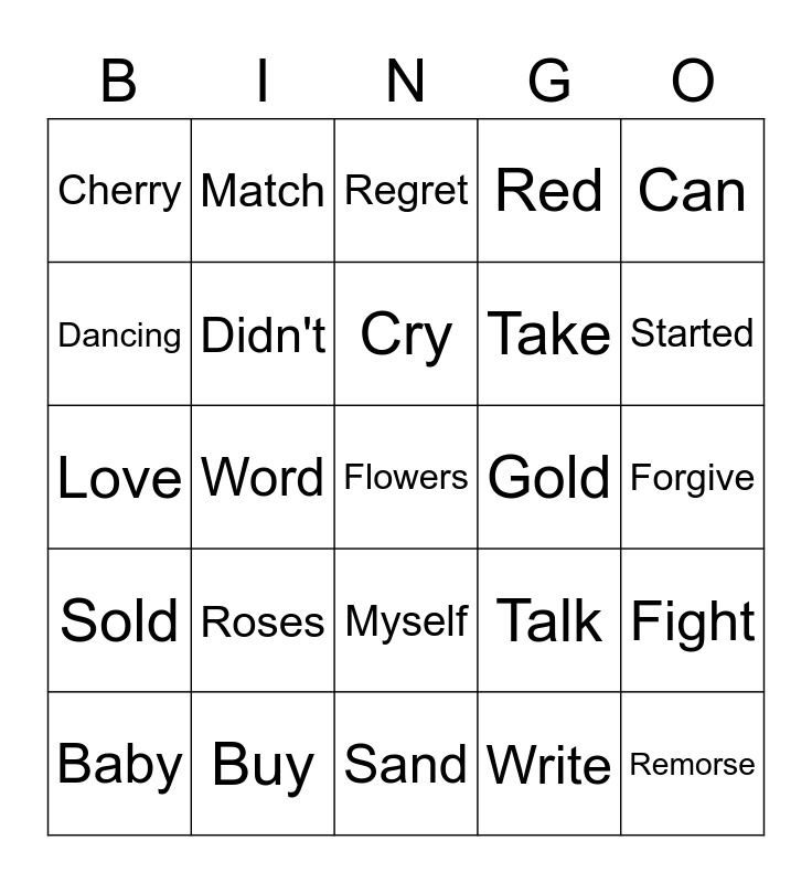 This bingo card has a free space and 24 words: Roses, Buy, Cry, Baby, Can, Cherry, Dancing, Match, Gold, Myself, Take, Love, Talk, Fight, Didn't, Write, Forgive, Regret, Started, Word, Remorse, Sold, Red and Sand.