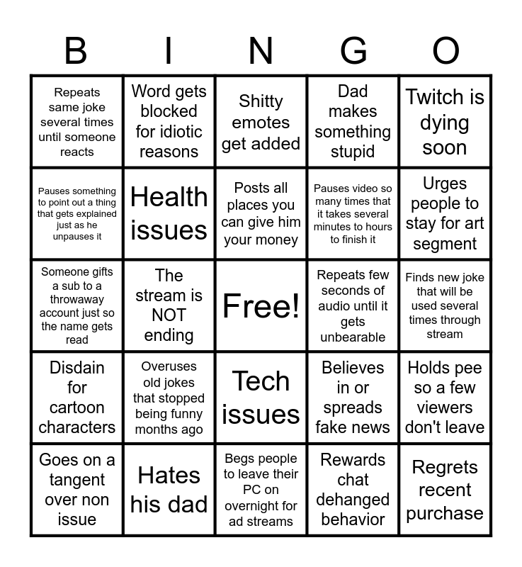 This bingo card has a free space and 24 words: Overuses old jokes that stopped being funny months ago, Hates his dad, Posts all places you can give him your money, Goes on a tangent over non issue, Twitch is dying soon, Repeats same joke several times until someone reacts, Pauses something to point out a thing that gets explained just as he unpauses it, Word gets blocked for idiotic reasons, Repeats few seconds of audio until it gets unbearable, Tech issues, Pauses video so many times that it takes several minutes to hours to finish it, Someone gifts a sub to a throwaway account just so the name gets read, Believes in or spreads fake news, Holds pee so a few viewers don't leave, Health issues, Rewards chat dehanged behavior, Finds new joke that will be used several times through stream, Shitty emotes get added, Urges people to stay for art segment, The stream is NOT ending, Regrets recent purchase, Disdain for cartoon characters, Dad makes something stupid and Begs people to leave their PC on overnight for ad streams.