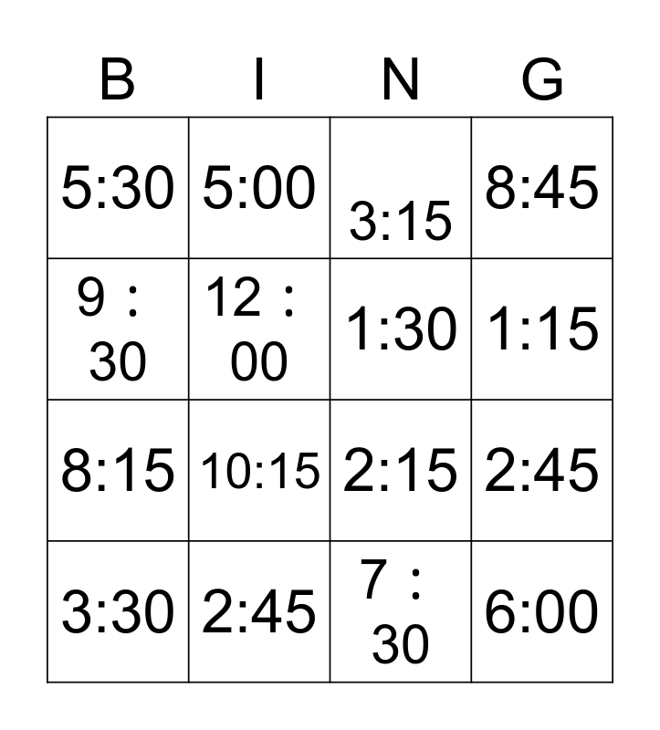 This bingo card has 16 words: 2:45, 2:45, 3:15, 5:30, 8:15, 5:00, 2:15, 7:30, 9:30, 12:00, 3:30, 8:45, 10:15, 1:15, 1:30 and 6:00.