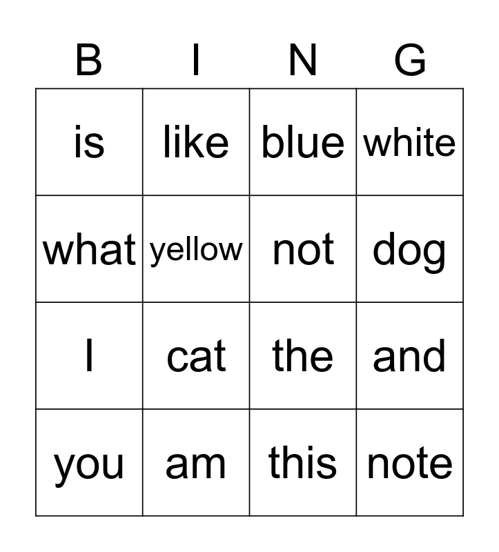 This bingo card has 16 words: am, and, blue, is, I, like, the, this, what, yellow, you, white, cat, dog, not and note.