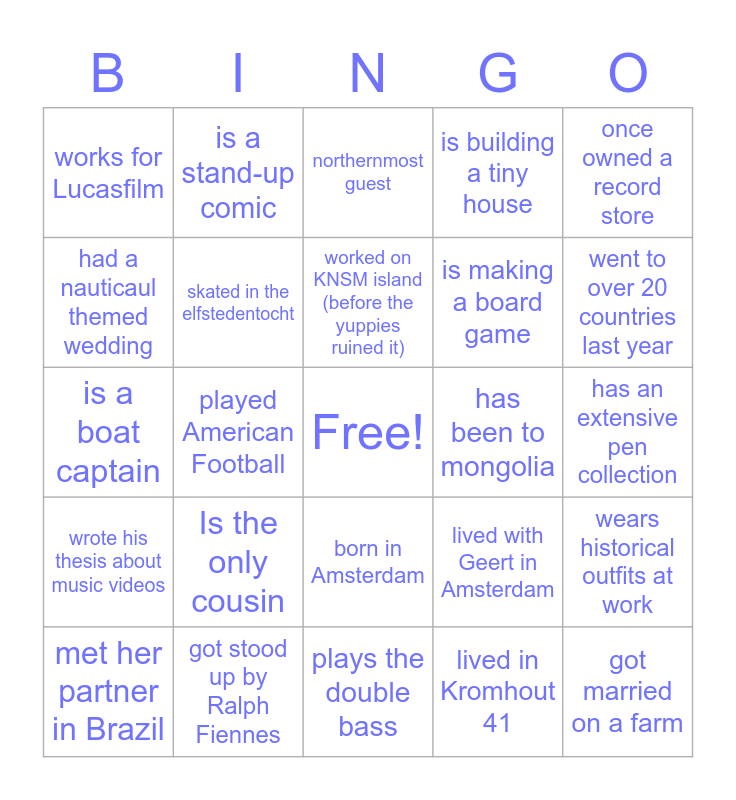 This bingo card has a free space and 38 words: tandem cycled from NL to Vienna, launches things to space, works in a nunnery, skated in the elfstedentocht, wears historical outfits at work, Is the only cousin, worked on KNSM island (before the yuppies ruined it), met Marjanne in Argentina, once owned a record store, is making a board game, played American Football, is building a tiny house, got married on a farm, has an extensive pen collection, had a nauticaul themed wedding, wrote his thesis about music videos, Marjann'es dad's former roommate's daughter, northernmost guest, worked in a gay bar for 1 night, has been to mongolia, works for Lucasfilm, got stood up by Ralph Fiennes, went to over 20 countries last year, met her partner in Brazil, was arrested with Geert, plays the double bass, loves Miffy/Nijntje, sang at his own wedding, is also getting married in Portugal this year, grew up on the same street as Geert, had lots of machine guns at their wedding, born in Amsterdam, lived in Kromhout 41, is a stand-up comic, born in the USSR, lived with Geert in Amsterdam, is a boat captain and we stole the bingo idea from.