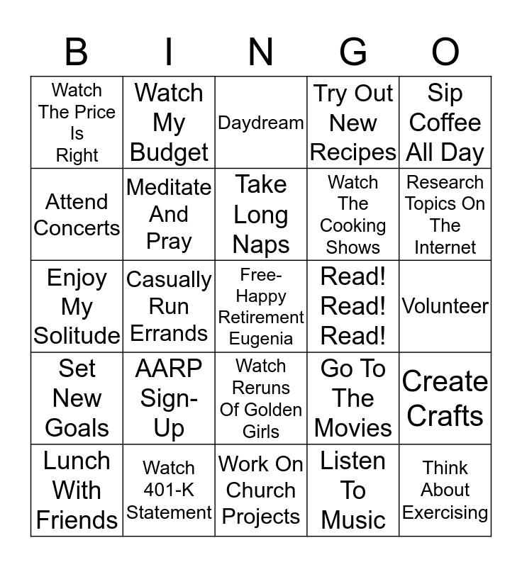 This bingo card has a free space and 24 words: AARP Sign-Up, Watch 401-K Statement, Take Long Naps, Lunch With Friends, Sip Coffee All Day, Watch The Price Is Right, Attend Concerts, Watch My Budget, Read! Read! Read!, Watch Reruns Of Golden Girls, Watch The Cooking Shows, Enjoy My Solitude, Go To The Movies, Create Crafts, Meditate And Pray, Listen To Music, Volunteer, Daydream, Research Topics On The Internet, Casually Run Errands, Think About Exercising, Set New Goals, Try Out New Recipes and Work On Church Projects.