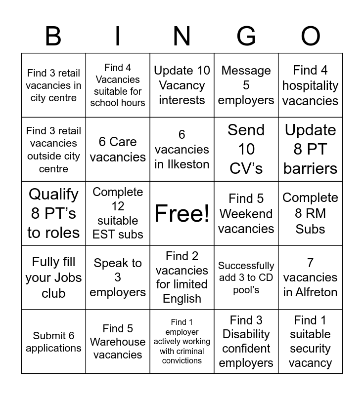 This bingo card has a free space and 24 words: Speak to 3 employers, Find 5 Warehouse vacancies, 6 vacancies in Ilkeston, Submit 6 applications, Find 4 hospitality vacancies, Find 3 retail vacancies in city centre, Find 3 retail vacancies outside city centre, Find 4 Vacancies suitable for school hours, Find 5 Weekend vacancies, Find 2 vacancies for limited English, Send 10 CV’s, Qualify 8 PT’s to roles, Successfully add 3 to CD pool’s, 7 vacancies in Alfreton, 6 Care vacancies, Find 3 Disability confident employers, Complete 8 RM Subs, Update 10 Vacancy interests, Update 8 PT barriers, Complete 12 suitable EST subs, Find 1 suitable security vacancy, Fully fill your Jobs club, Message 5 employers and Find 1 employer actively working with criminal convictions.