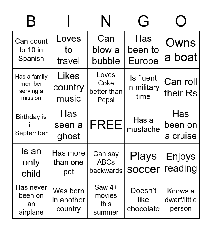 This bingo card has a free space and 123 words: Speaks multiple languages, Has more than one pet, Has brown eyes, Has run a marathon, Has a twin, Doesn’t go by their first name, Loves to travel, Likes sushi, Saw 4+ movies this summer, Enjoys reading, Was born in another country, Birthday is in September, Can whistle, Has had broken a bone, Is left handed, Has a younger sibling, Has never been on an airplane, Has gone snorkeling, Birthday is in January, Is an only child, Doesn’t like chocolate, Loves Coke better than Pepsi, Loves Chocolate, plays a sport, Speaks multiple languages, Has been to Europe, Was born in another country, Is left handed, Wants to serve a mission, Is in choir, Has been on TV, Birthday is in September, Is an only child, Is in band, Has never been on an airplane, Is wearing a Seahawks shirt, Favorite sport is football, Knows sign language, Has never been to Disney- land, Is happy to be here, Plays soccer, Owns a horse, Has had a broken a bone, Knows what ASK stands for, Has 3 siblings, Has an Instagram account, Has a twin, Birthday is in June, Doesn’t go by their first name, Has more than one pet, Is the baby in their family, Prefers coke over Pepsi, Favorite season is Autumn, Likes to sing, has curly hair, Is over 6 feet tall, Has blue eyes, Is wearing a red shirt, Is wearing animal print, Member of a gym, Is CPR certified, Has been to Canada, Has been to Hawaii, Is wearing a watch, Is the middle child, Has a mustache, Can hula hoop, Sings karaoke, Has been on a cruise, Wears glasses/contacts, Can do the splits, Favorite candy is Twix, Can blow a bubble, Can whistle, Can do a cartwheel, Grew up on a farm, Likes to hunt/fish, Owns a boat, Plays volleyball, Has a desktop at home, Has an iPhone, Has a Droid, Enjoys reading, Has a family member serving a mission, Has 5 siblings, Has a nephew, Is fluent in military time, Drives a truck, Drives a convertible, Doesn’t drink soda, Is 18, Likes 80’s music, Likes country music, Knows a dwarf/little person, Can name all 12 apostles, Doesn’t have a cell phone, Can solve a Rubix Cube, Has been bungee jumping, Has met a celebrity, Can ice skate, Can say ABCs backwards, Can cross their eyes, Can count to 10 in Spanish, Can curl their tongue, Is double jointed, Understands the rules of soccer, Has seen a ghost, Has been to a haunted house, Owns a Swiss Army knife, Knows Spiderman’s real name, Owns a record (LP/album), Has been to Italy, Has been to Ireland, Has been to South America, Has been to China, Keeps a diary or journal, Plays golf, Can play a musical instrument, Can name the planets in order, Can name the colors of the rainbow in order, Can play chess, Can roll their Rs and Can change a tire.
