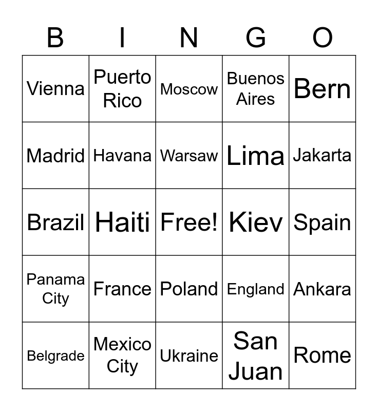 This bingo card has a free space and 60 words: Washington D.C., Mexico City, Ottawa, Panama City, San Juan, Kingston, Havana, Port-au-Prince, Lima, Brasilia, Buenos Aires, Paris, Madrid, Lisbon, London, Vienna, Rome, Bern, Berlin, Warsaw, Kiev, Moscow, Belgrade, Ankara, Athens, Port Moresby, Suva, Wellington, Jakarta, Canberra, United States of America, Mexico, Canada, Panama, Puerto Rico, Jamaica, Cuba, Haiti, Peru, Brazil, Argentina, France, Spain, Portugal, England, Austria, Italy, Switzerland, Germany, Poland, Ukraine, Russia, Serbia, Turkey, Greece, Papua New Guinea, Fiji, New Zealand, Indonesia and Australia.
