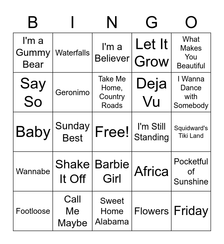 This bingo card has a free space and 40 words: I Want it That Way, Baby, All Star, Geronimo, Call Me Maybe, Barbie Girl, Take Me Home, Country Roads, Lost Boy, What Makes You Beautiful, Wannabe, Sunday Best, Let It Grow, Friday, Squidward's Tiki Land, I'm Still Standing, Shake It Off, Party in the USA, I'm a Gummy Bear, We Like to Party, I'm a Believer, Pocketful of Sunshine, Flowers, Deja Vu, Say So, Burnin' Up, Bad Habit, Thunderstruck, Levitating, Shotgun, Dancing Queen, Man I Feel Like a Woman, Footloose, I Want You Back, Africa, I Wanna Dance with Somebody, Sweet Home Alabama, Never Gonna Give You Up, September, Waterfalls and Bye Bye Bye.